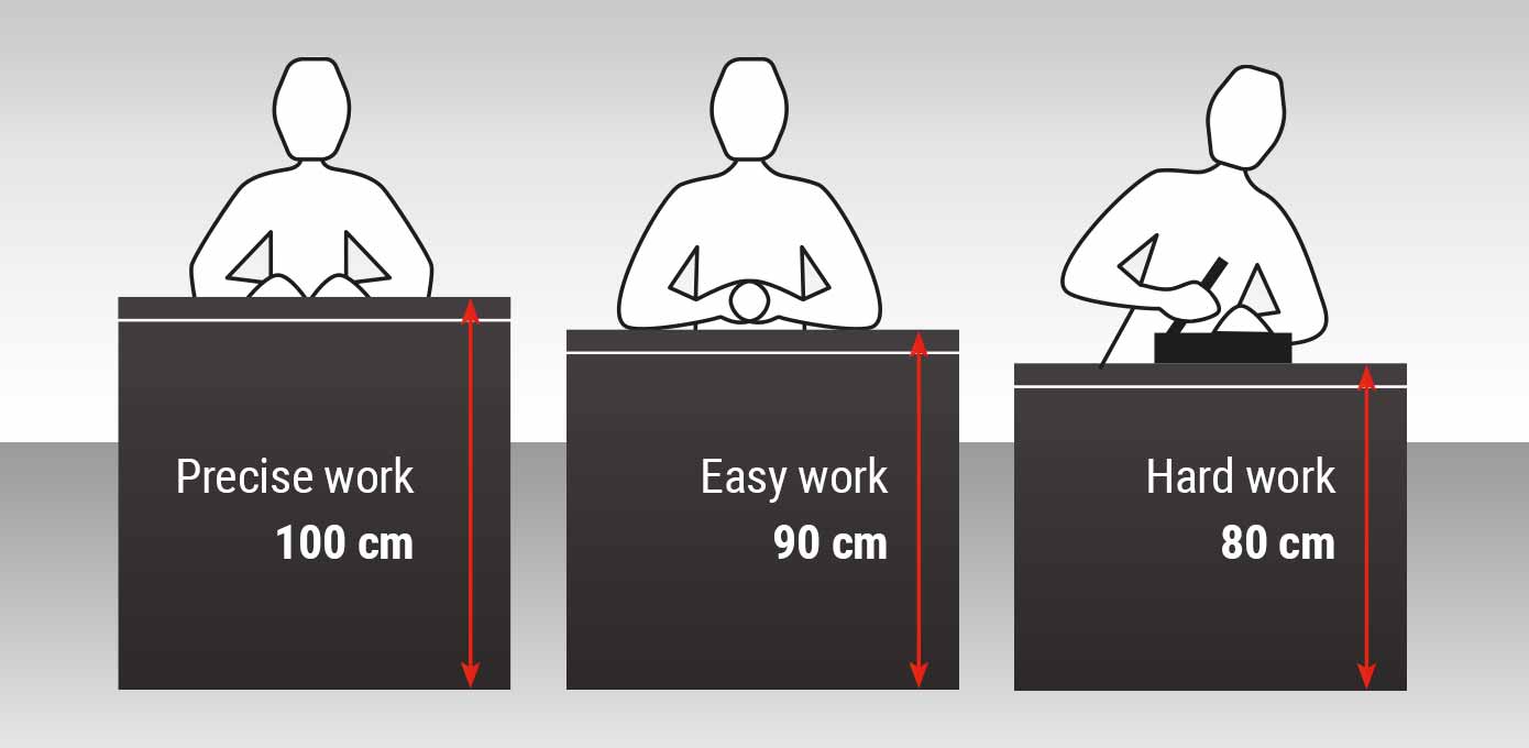 The WorkMo modules are available in various different widths (526 mm, 789 mm, 1,052 mm) and heights (506 mm, 744 mm). This lets you adapt the WorkMo to each work situation. If you have heavy work to carry out, for example, we recommend using the WorkMo height 750 (744 mm). If you have fine adjustment work, on the other hand, the ideal working height of one metre is achieved using two WorkMo 500 modules (each 506 mm) stacked one above the other.