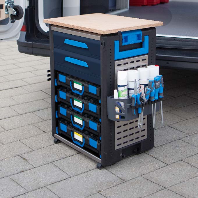 Rely on RACK O VAN combinable modules – your mobile workstation becomes your tidy “on-the-road workshop”. The WorkMo range is designed to let you combine the individual models to meet your precise needs and, thanks to the flexibility of the system, you can decide from job to job whether you need the entire workstation with you, or simply individual modules. And if the entire work-station is needed on site, the practical Roller trolley on wheels ensures that it can be conveniently transported, converting the WorkMo into a portable work bench. Dragging heavy tool boxes is now a thing of the past and conveniently you always have your complete kit on site with you.