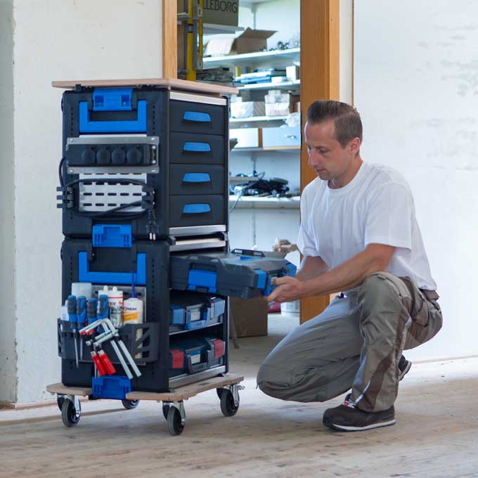 And should you be looking for a storage system for your workshop – then look no further than the flexible WorkMo. Modules in widths 3 and 4 are ideal for this, as they provide plenty of storage space in the form of useful drawers, although they also hold BOXXes and cases. Remove them whenever you need to and take them with you to site.