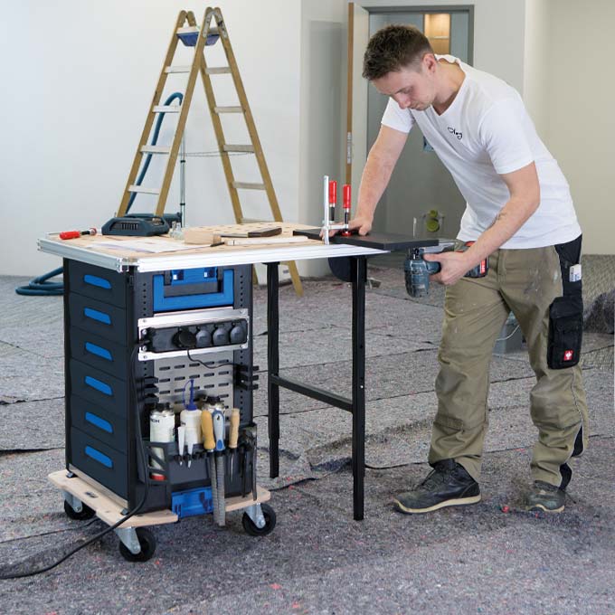The WorkMo is always ready as your adaptable work aid in all situations, as workshop trolleys, workshop shelves, work benches, transport equipment or as a work station. Holders for accessories, multiple sockets, a worktop and a clamping system make a functional workplace out of the transport and organisation system, which you can use to adapt your components on site in all kinds of ways.
