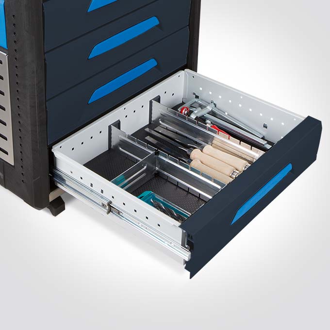 The modules in different widths and heights, which can be combined at will, help with the organised storage of tools and consumables. The modules can be equipped with drawers Globelyst, shelves, BOXXes and cases, which can simplify detailed and individual organisation of working materials using additional sub-divisions.