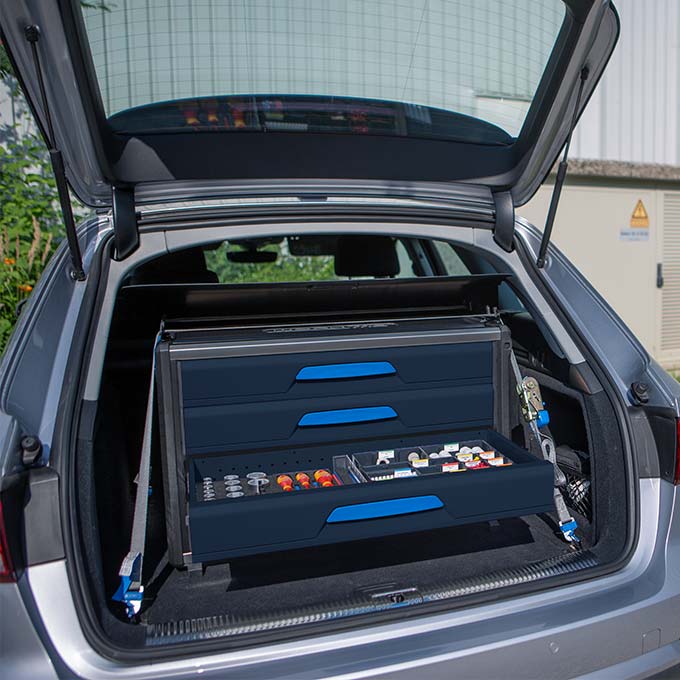 The WorkMo modules are ideally suited as a transport solution for car boots, for field service staff, service technicians etc. The modules can be used to transport the materials stowed away safely and neatly. Flexible use of the car is further facilitated since the modules can be integrated and removed with just a few gestures.