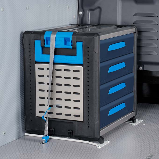 Individual lashing eyes are recessed in the SoboPro floor, making lashing of the WorkMo in the vehicle with the special ProSafe accessories quick and uncomplicated. In addition, every floor can be retrofitted with the WorkMo Fix positioning stop. This saves time and secures tools and materials in transit.