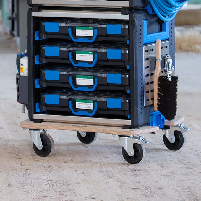 The portable WorkMo workstation is ideal to use as a mobile work bench or as a workshop trolley. The 750 mm module configuration, complete with roller adapters and a worktop, converts into your handy ‘workmate’. Whether you’re working in your garage, on a hobby or in a professional workshop, the WorkMo guarantees a tidy and well organised workplace at all times. Configure the module to meet your requirements and equip it with drawers, with partitions in the form of dividers or inset boxes, or with BOXXes and cases.